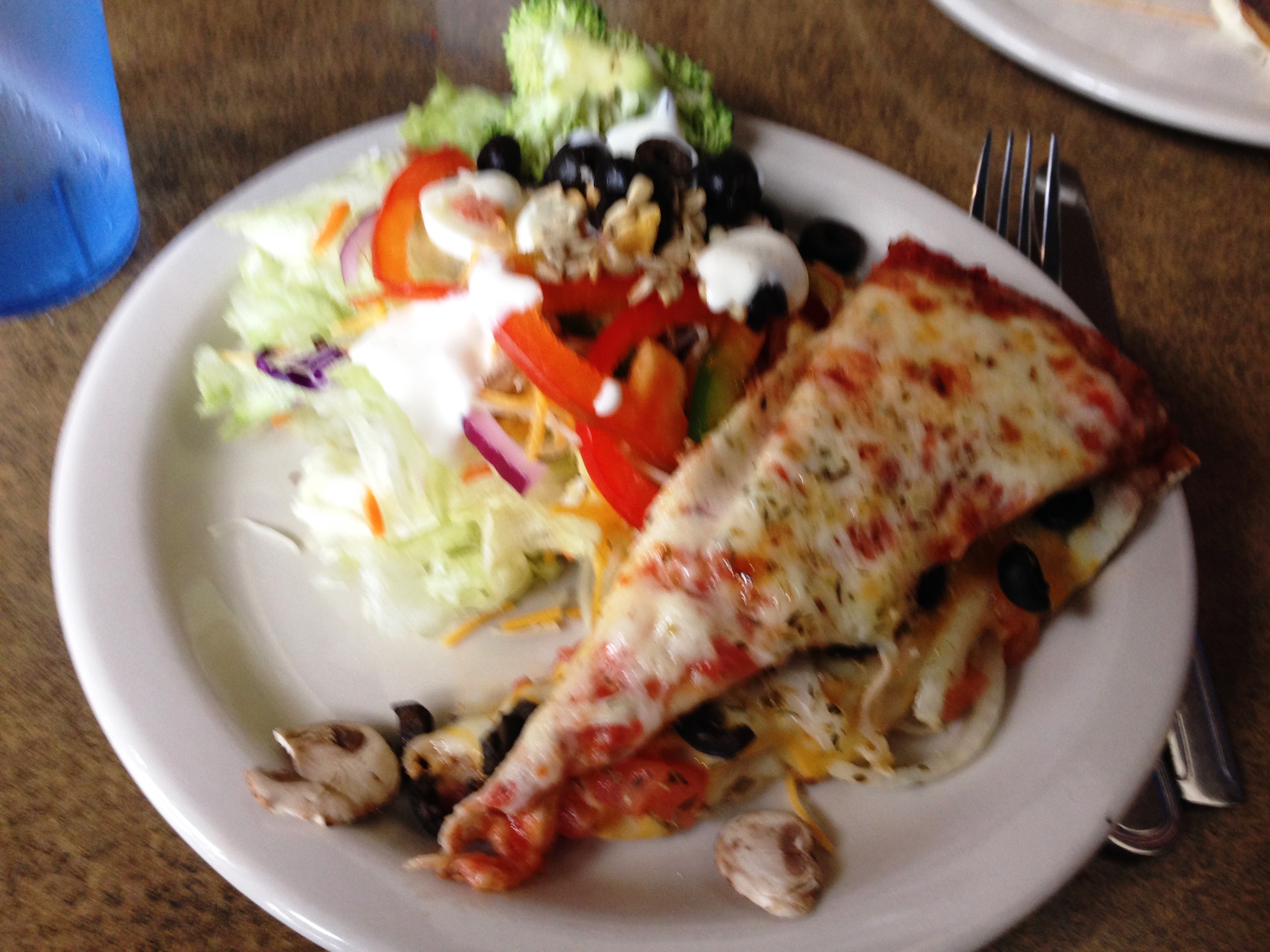 11:45: Scott takes us to a local Green Bay sports bar for lunch. They have a lunch buffet, so I opt for that. I forget to take a picture of the cup of stuffed pepper soup I had, but it is good and it hits the spot – I am freezing. The rest of the lunch buffet consists of a pretty pathetic salad bar and pizza. The pizza is actually quite good – and hey, at least it wasn’t Applebee’s! The photo is fuzzy – bad Sarah – but you get the idea. I also snap a photo of David’s “Lombardi Burger” – a burger topped with hot artichoke dip. When in Rome, right?