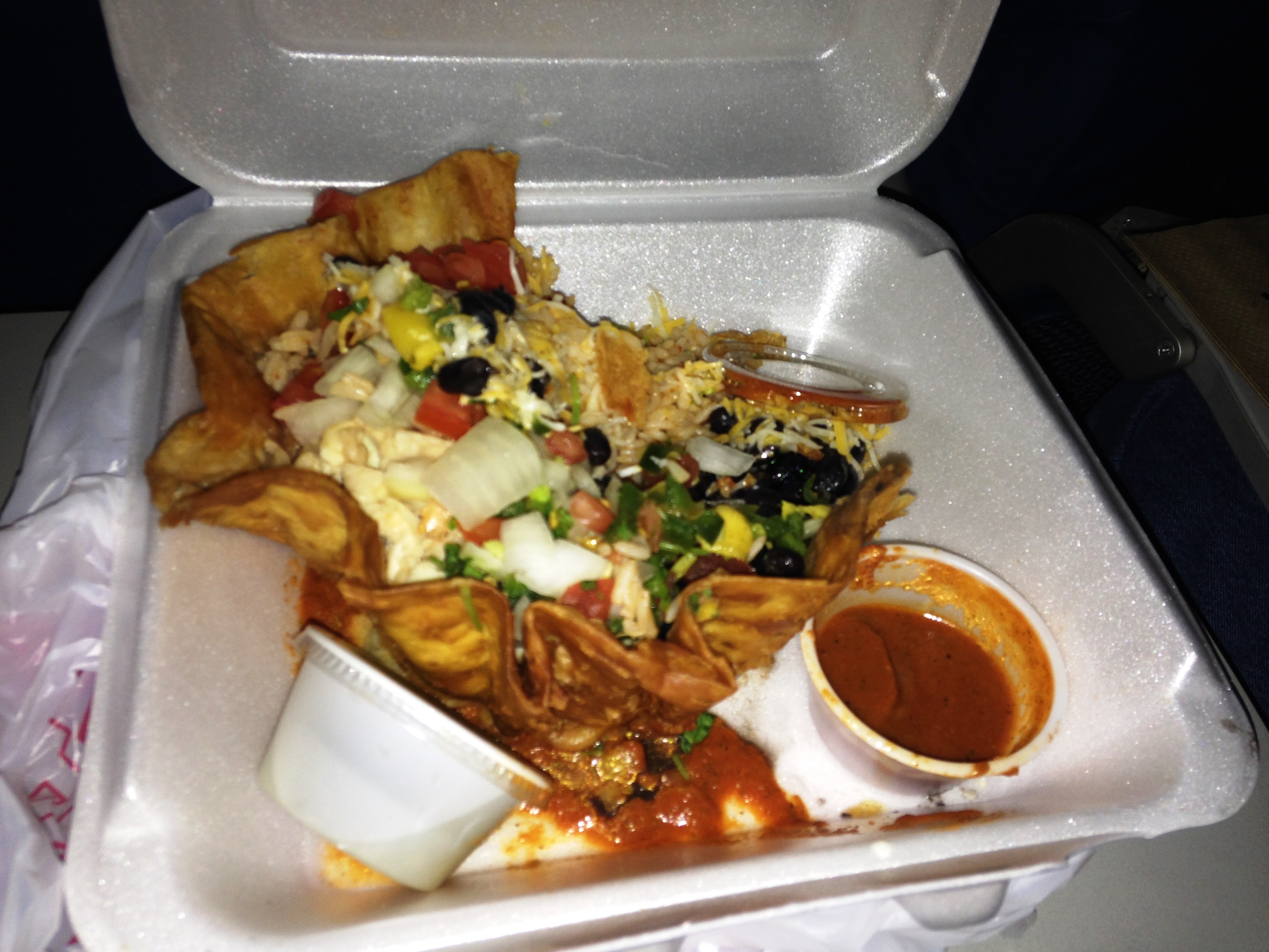 6:45: Arrive in Minneapolis, slightly delayed. This time, we do have to huff it to board our flight on time, especially since we want to grab some dinner to take on the plane. Opt for a mango chicken salad from some taco place next to the gate.