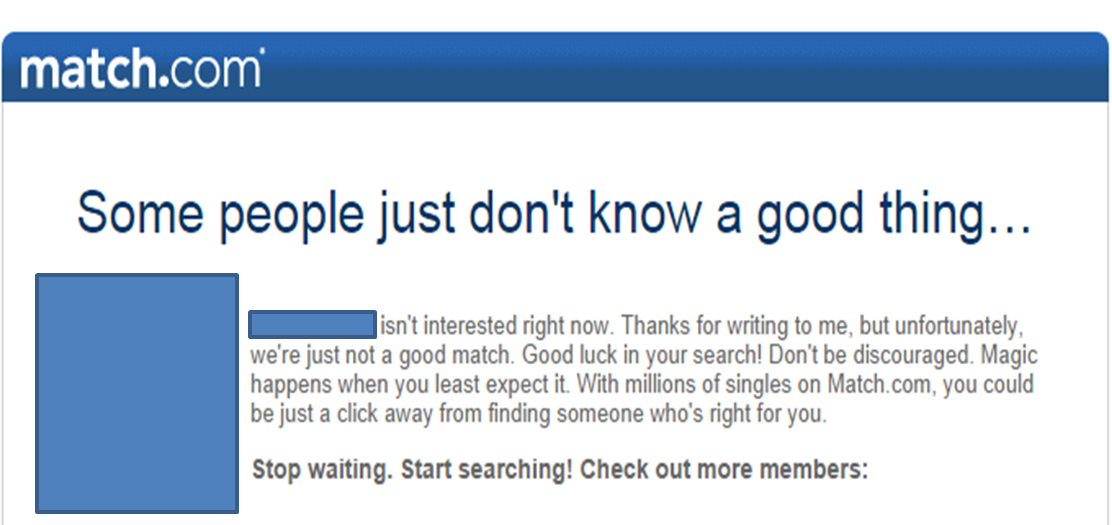 I empathize with Drew’s plight. I, for one, really do put myself out there – those of you who know me know that I’m hardly a girl who hides in her house and then wonders why she hasn’t met someone. On the contrary, I’m really “out there” – I ask men out on napkins, I strike up conversations with boys at the gym, I encourage people to set me up with their cousin’s cousin. I belong to multiple dating sites, and lest you think I wait around for the cute guys to email me, oh no! On the contrary, I send emails all the time – most of which go unanswered, sometimes at an alarmingly high rate. Just recently, I received a response to a match.com email I had written over a week prior. I got excited, thinking that finally someone had written me back – only to discover this: