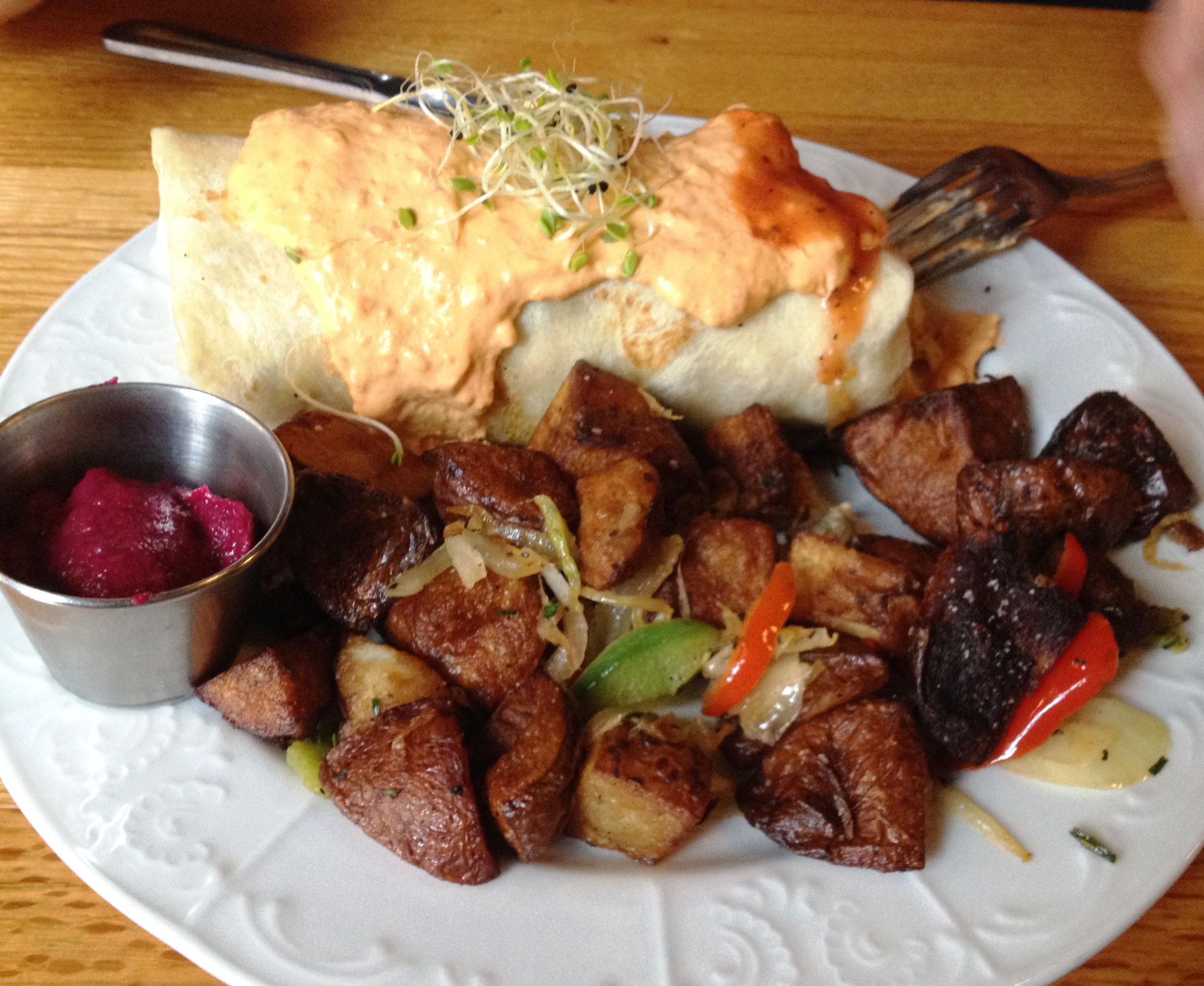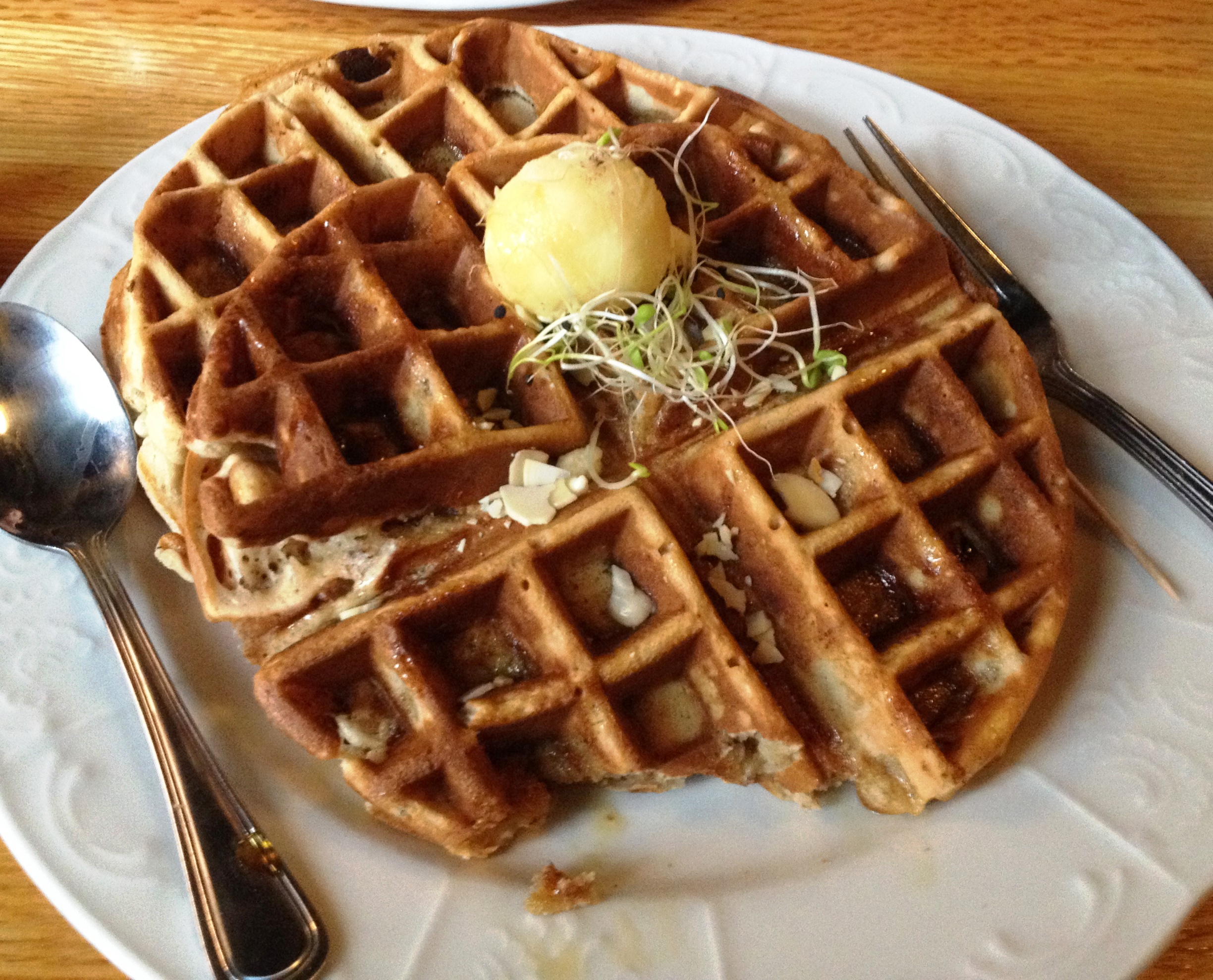 My “date” and I shared the Fig and Goat Cheese Waffles and the Breakfast Burrito, along with hot coffee. As a savory breakfast person, it’s very rare that I order waffles or pancakes for brunch. But we both thought these waffles sounded too good not to order (ok, to be fair, he wanted the strawberry and basil waffles…but I won out), and they were to-die-for. The waffle itself was just slightly sweet – not overly figgy or goat cheesy. That glob on top? That’s a honey goat cheese ball – yep, a honey goat cheese ball! And the breakfast burrito was also very tasty – the chorizo was a bit spicy and the cream sauce on top was really flavorful. We did not eat all of this – not even close – but I may have eaten the leftover burrito a couple of hours later. I will be back, and hopefully soon!