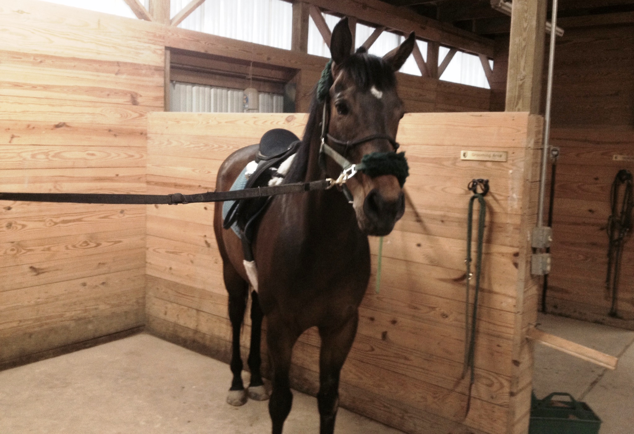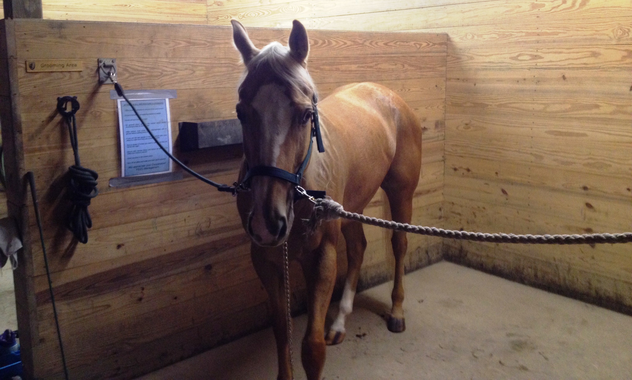 So on Sunday afternoon (after the epic brunch), I donned my most barn-appropriate clothes, some old boots, and a brave face and headed to the horse barn! Wyatt’s family has two horses: Pericles and Perseus (he was a Classics major…). His mom rescued both horses – Pericles is an off-the-track Thoroughbred rescue and Perseus a Palomino Quarter Horse. Pericles can be ridden (carefully – he’s pretty feisty apparently), but Perseus can’t be – at least not right now. Persues is lame in his front hoof due to complications from an abscess from stepping on a nail in a world competition (yes, I may have pulled that description directly from a text…you think I can remember all of that?!).