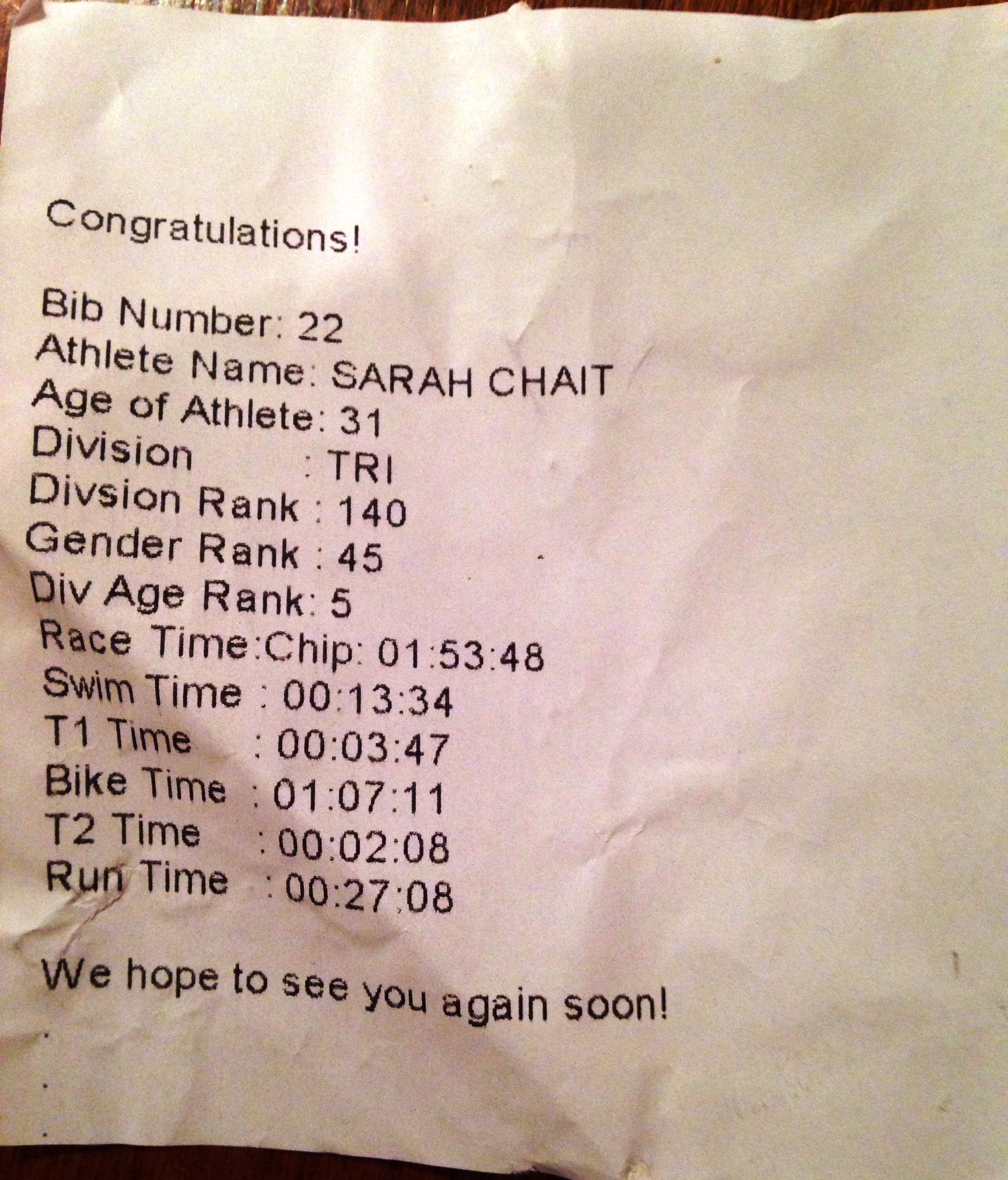 Total time: 1:53:48.  It’s difficult to compare race to race, as all of the distances and transitions vary.  But it’s safe to say that I improved in all three sports!  Now about those transitions…. Also, I thought it was cool that you could get a printout of your results almost immediately following the race.  009