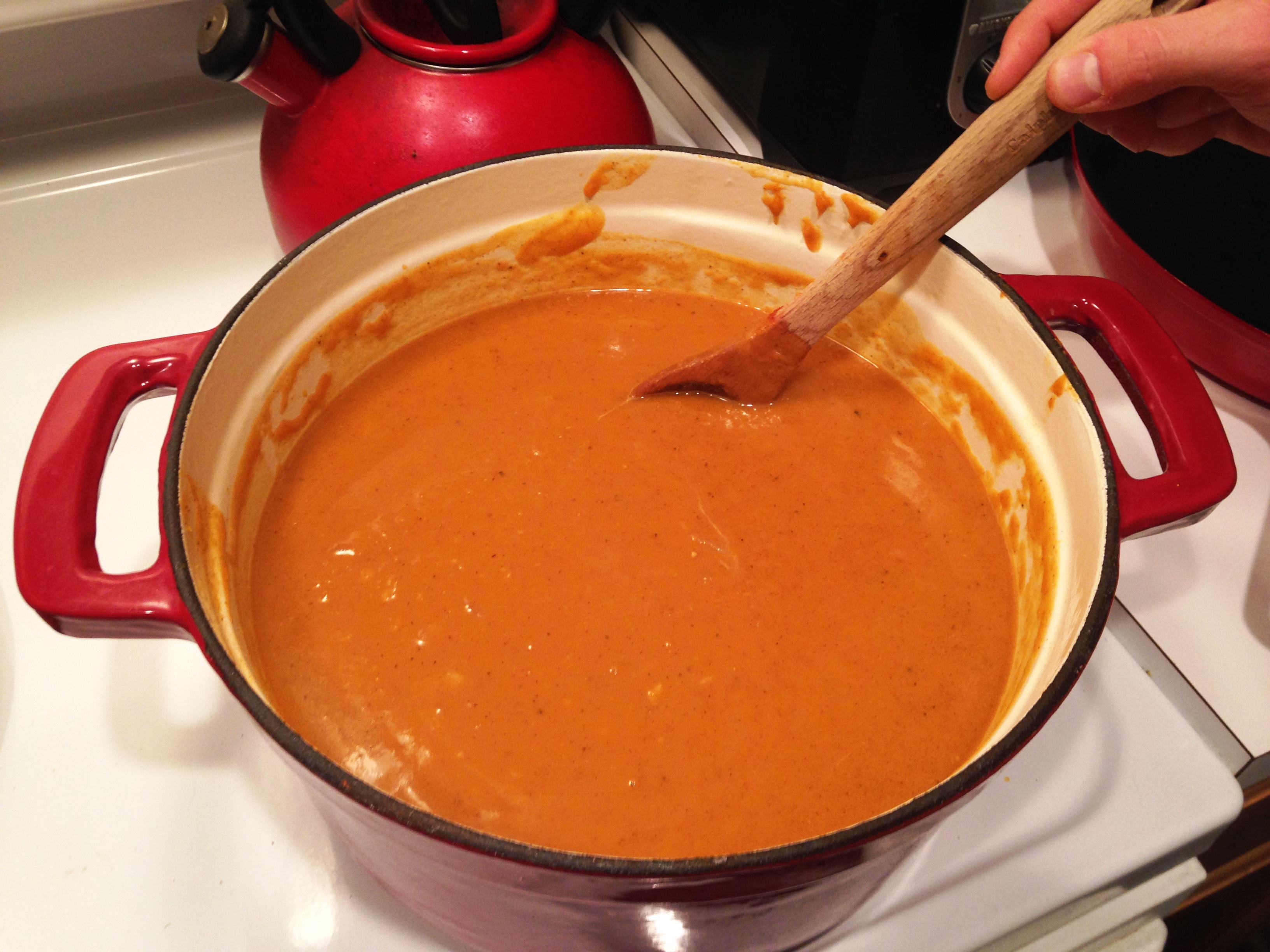 I know Thanksgiving was a week ago and any leftovers you had are long gone, but this leftover creation is just too good not to share! By Sunday, my Mom – who is the queen of not wasting food – had had enough of Thanksgiving leftovers and was about to toss out some plain cooked sweet potatoes. Good thing I intervened! I had been planning on making a sweet potato chili of sorts that night, so figured I could re-purpose them somehow. My mom also gave me her immersion blender the night before when I mentioned wanting one for Christmas – score! So on my drive home, I had a bright idea – since the sweet potatoes were cooked (read: almost mushy) and I was the proud new owner of an immersion blender, why not make a coconut curry sweet potato bisque of sorts instead?